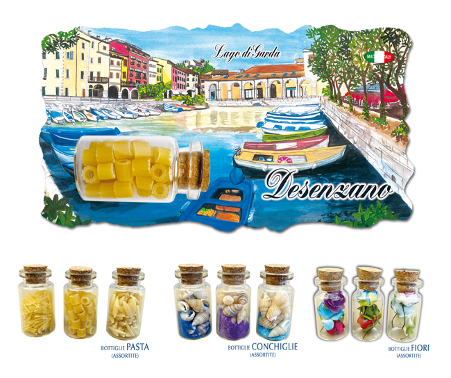 Magnete in resina ecologica effetto marmetto cm 10,5×6 con bottiglietta contenente sabbia e conchiglie, fiori o pasta