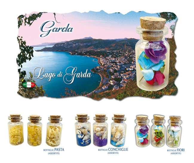 Magnete in resina ecologica effetto marmetto cm 10,5×6 con bottiglietta contenente sabbia e conchiglie, fiori o pasta