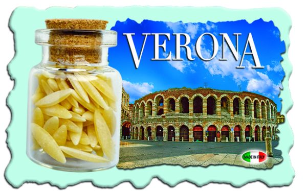 Magnete in resina ecologica effetto marmetto cm 7,5×4,7 con bottiglietta contentente pasta; disponibilie in alternativa con bottiglietta contenente neve (AN079)